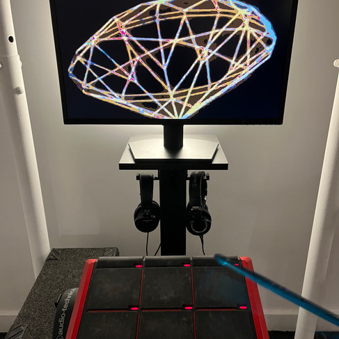 Right: The Video Percussion Synthesizer, by Zizza. Artist statement: With this device, you can play the video while you make a beat. Inspired by a mixture of sound and video synthesis techniques, I wanted to create a performable instrument based on a MIDI drum pad and a pair of sticks. Striking each drum pad synthesizes a drum sound in real-time. Each strike on the six main pads also triggers a video synthesizer to play a video clip. The video layers can be played over each other just like drum sounds. They will interact with each other and can also be manipulated globally via three additional synthesis algorithms dedicated across the top three pads.